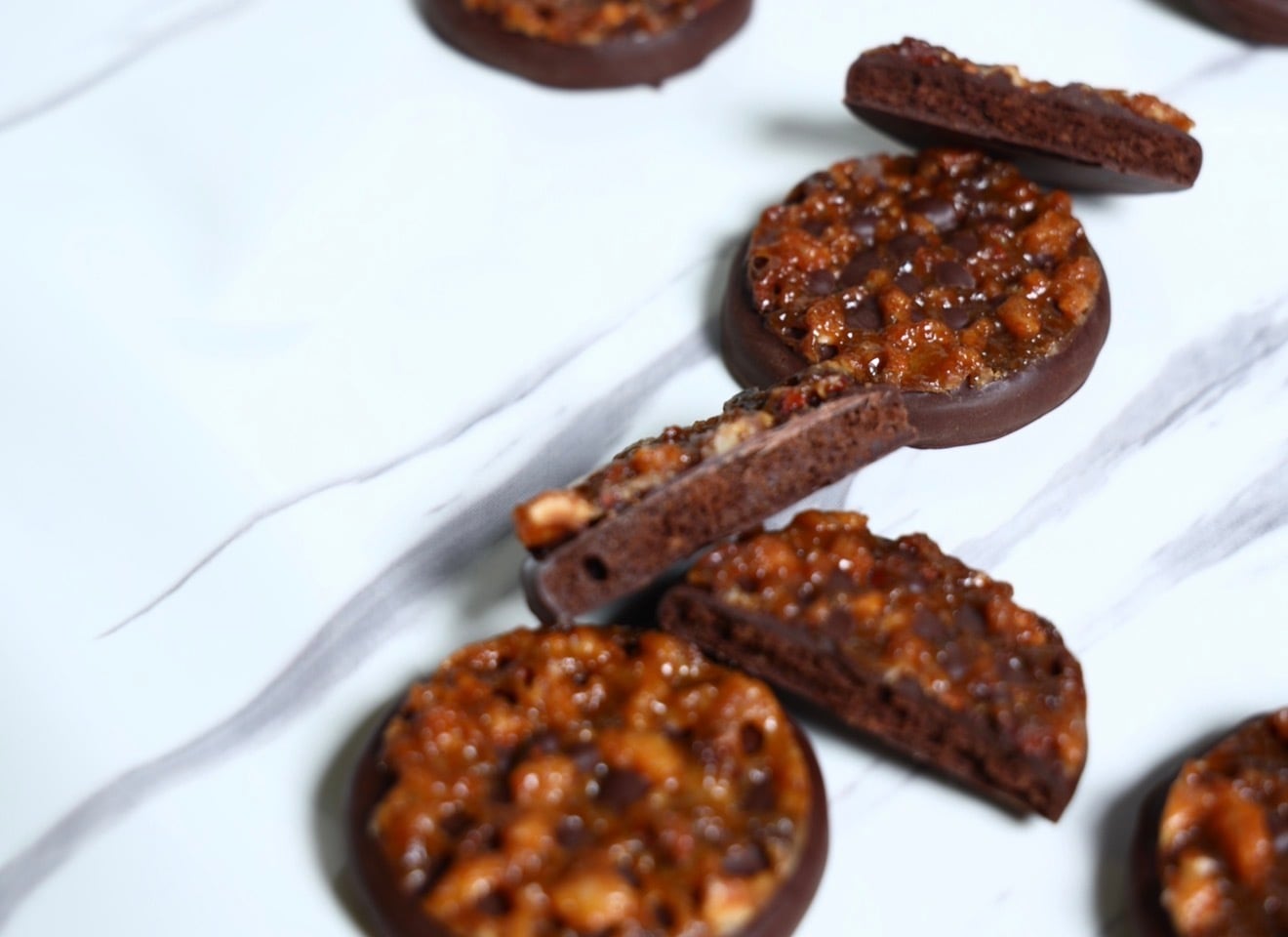 ざくざく食感のサブレぺカンにはアリバ50%のハイカカオのミルクチョコをコーティング