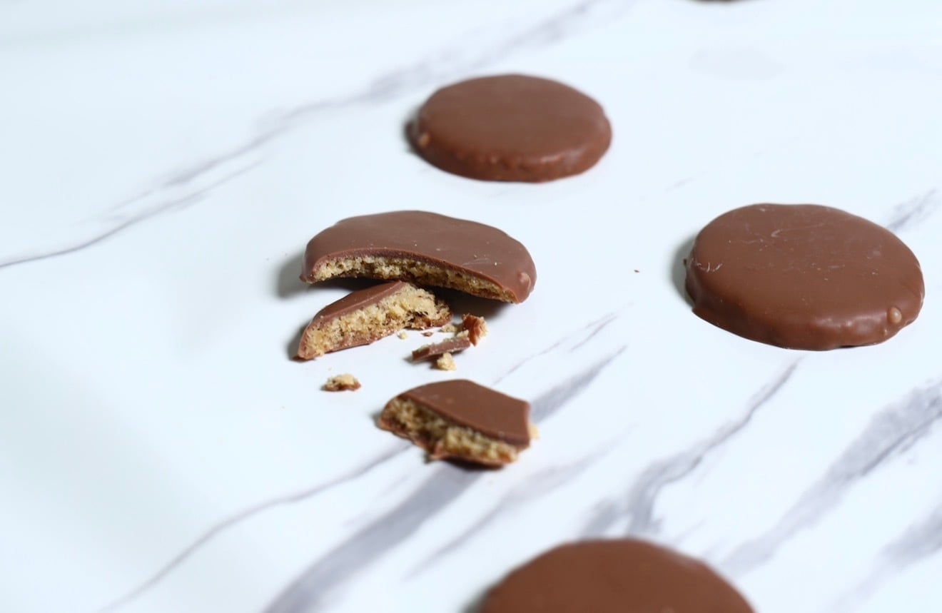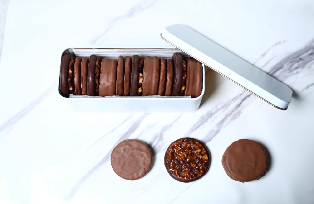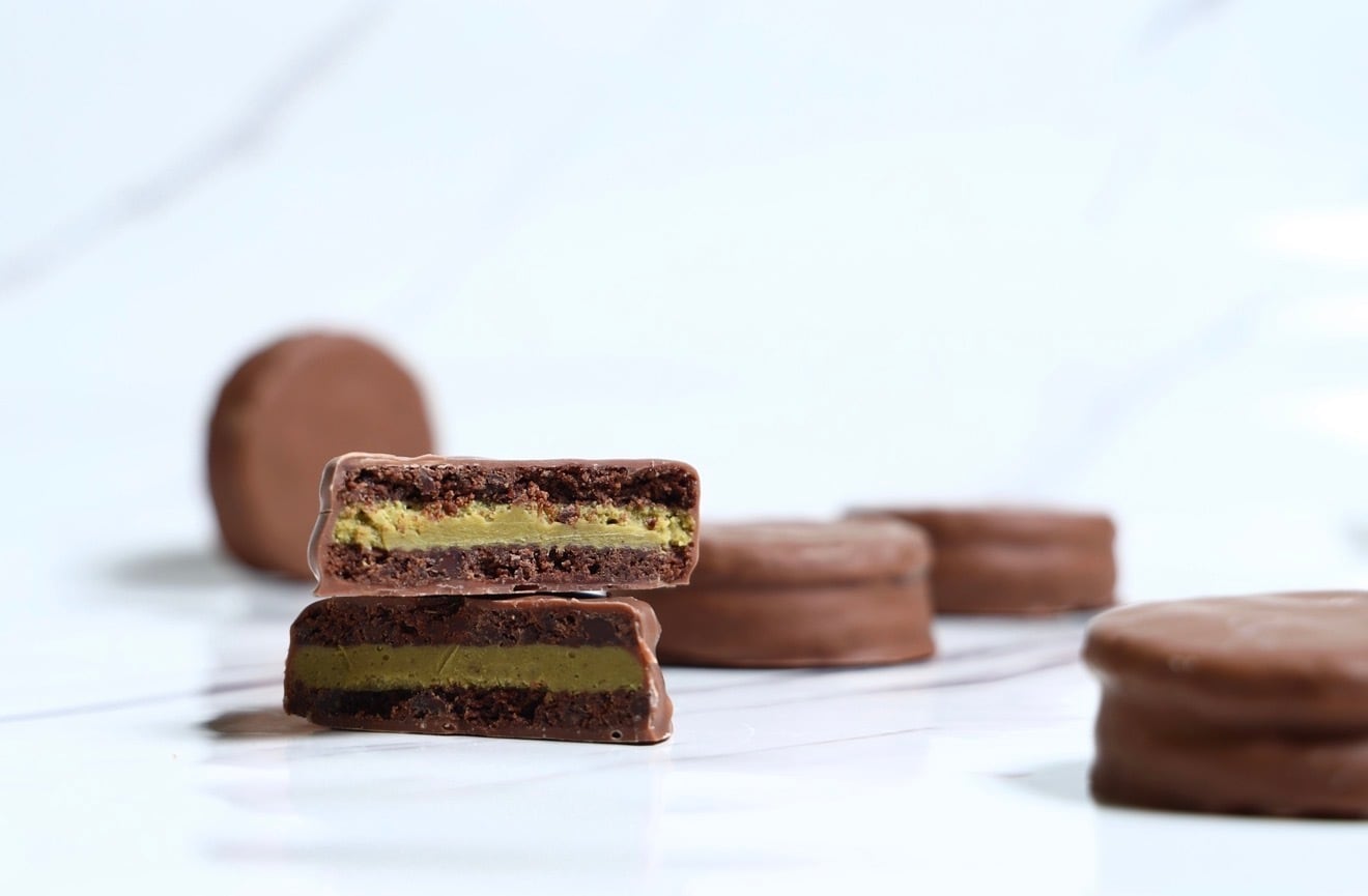 ほろほろのアリバ56%を練り込んだチョコクッキーに自家製プラリネピスターシュをサンド、アリバ36%をコーティング