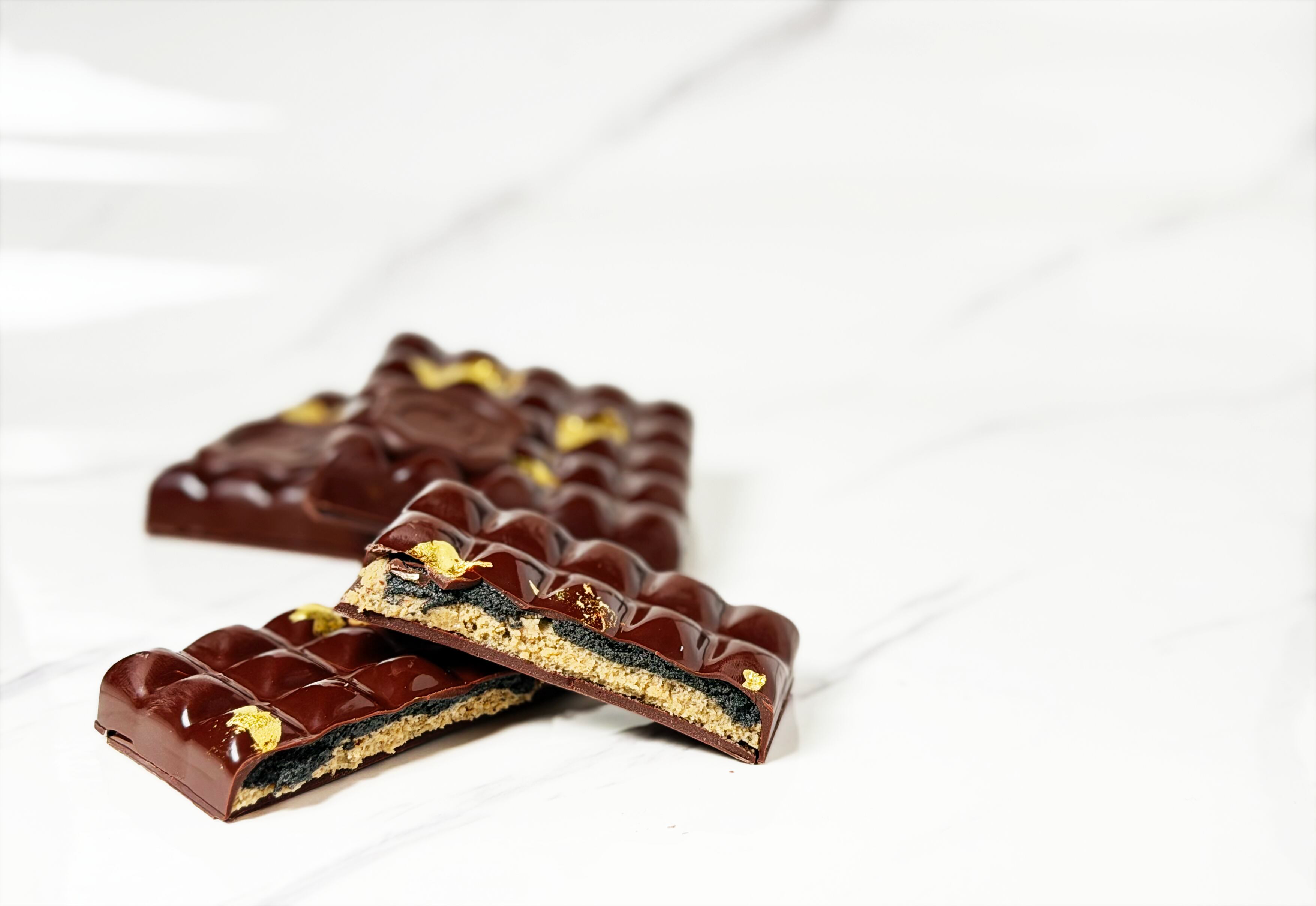 黒胡麻と和三盆をプラリネにしそのまま贅沢に一層、胡桃とバニラのペーストと胡麻のサブレを合わせたプラリネビスキュイショコラの二層で構成。